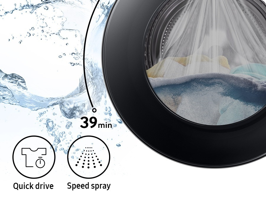 Grâce à QuickDrive™ associée à la technologie Speed Spray (jet deau additionnel aspergeant le linge par le dessus au moment du rinçage), et aux performances de nettoyage d'ecobubble™, le programme Super Rapide permet de laver 5kg de linge en seulement 39 min.