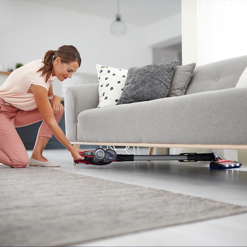 Le SpeedPro Max est flexible et facile à manier. Le bac à poussière est positionné en haut de l'aspirateur balai sans fil, ce qui permet d'augmenter son inclinaison, voire de le coucher sur le sol afin de nettoyer sous les meubles plats.